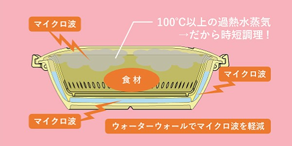 水の壁で電子レンジのマイクロ派を軽減することができます。マイクロ派が直接食材に当たりにくくなることで食材の良さを損なわずに調理します。容器内で発生した水蒸気はマイクロ派によって加熱され高温(100度以上)になり、加熱水蒸気によって短時間での調理が可能になります。