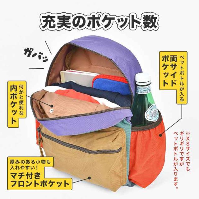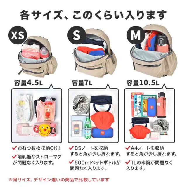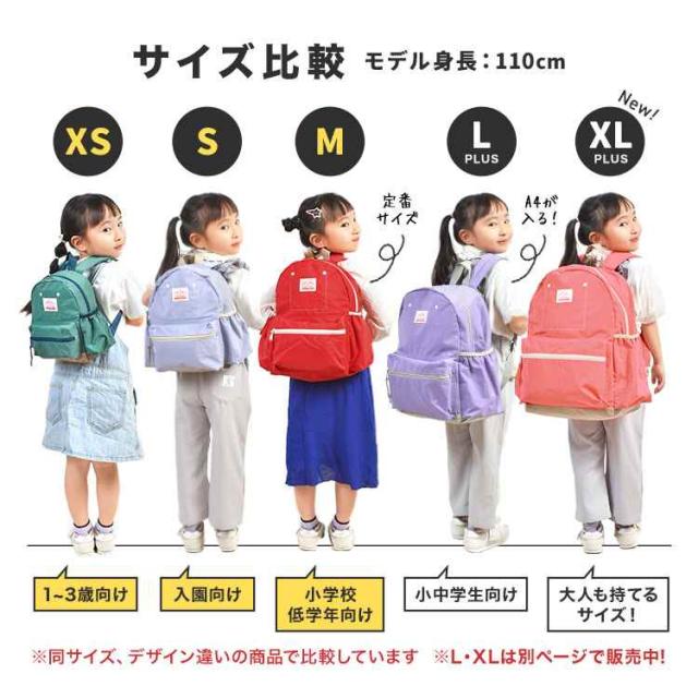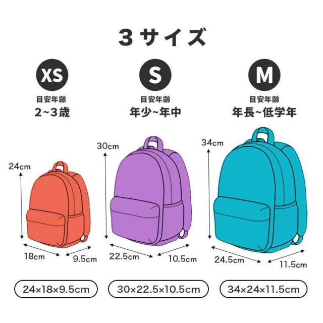 - 1歳半の娘にSサイズを購入。大きすぎず、自分で背負える程よい大きさです。容量はあまりありませんが、お弁当と水筒と着替えくらいなら普通に入るので十分です。 カラフルでとても可愛いと思います。