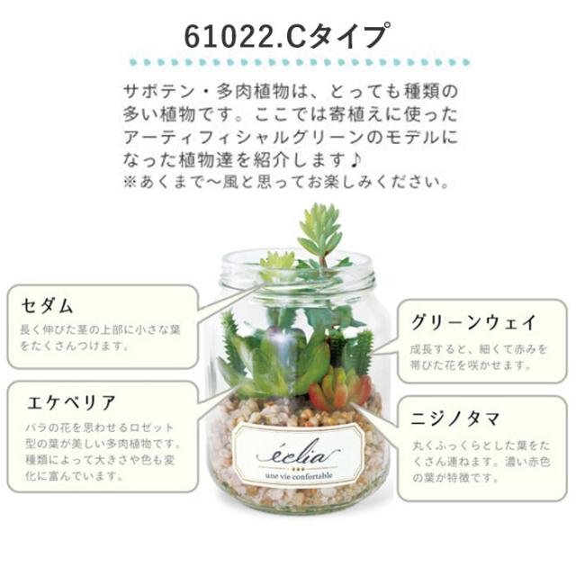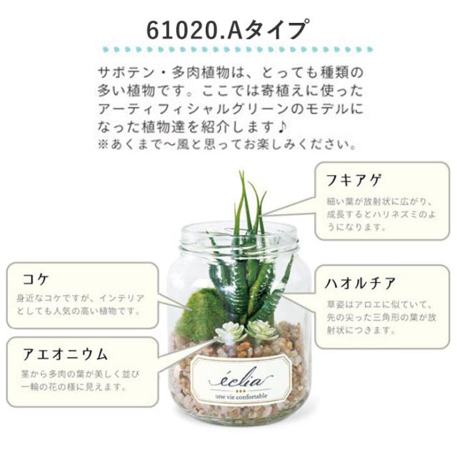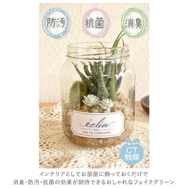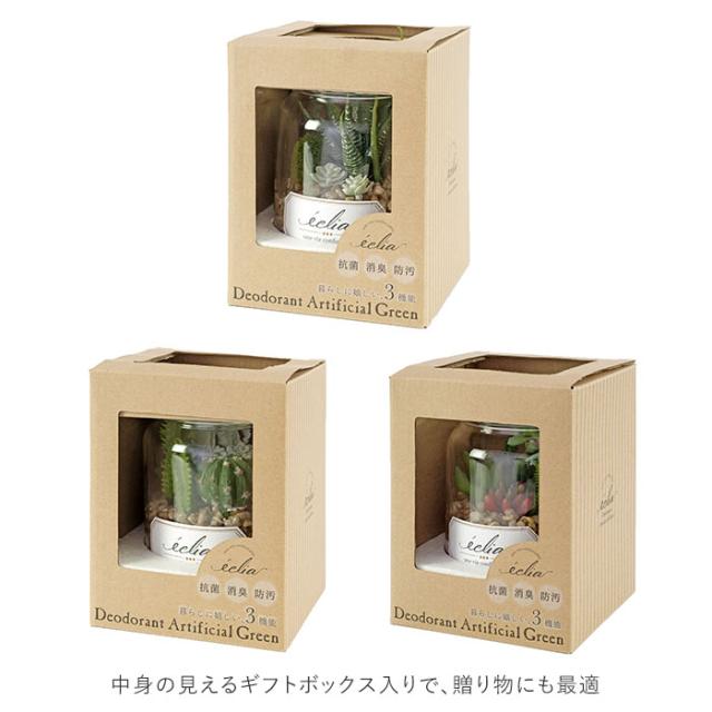 | 商品説明 | ・置いておくだけでお部屋の空気をキレイに変える♪エクリア・デオドラントアーティフィシャルグリーン。 ・インテリアとしてお部屋に飾っておくだけで消臭・防汚・抗菌の効果が期待できるおしゃれなフェイクグリーン。 ・エクリアは、見た目の華やかさだけではなく「CT触媒加工」が施された、機能的なフェイクグリーン。お部屋の消臭効果だけでなく、その抗菌作用で細菌やカビの増殖を防止する効果も! ・「CT触媒」とは、生体必須ミネラルに含まれる元素から厳選したミネラル複合体のこと。非常に安全性が高く、人体にも無害なので、小さなお子さまやペットのいるご家庭でも安心。 ・CT触媒の効果は、ホコリに埋もれない限り半永久的に効果を発揮!光のない暗い場所でも効果を発揮するため、お手洗いや玄関にも置きやすい♪ ・多肉植物やサボテンをスタイリッシュな瓶の中で寄せ植えにしたテラリウム風で、まるで本物の植物のような外観。フェイクグリーンとは思えない出来栄えで、とってもオシャレ♪ ・水やりやメンテナンスの手間が少ないので、お仕事や家事で忙しい方にもぴったり。リビングはもちろん、玄関やキッチンなどインテリアのワンポイントにオススメ。 ・中身の見えるギフトボックス入りで、贈り物にも最適。 |