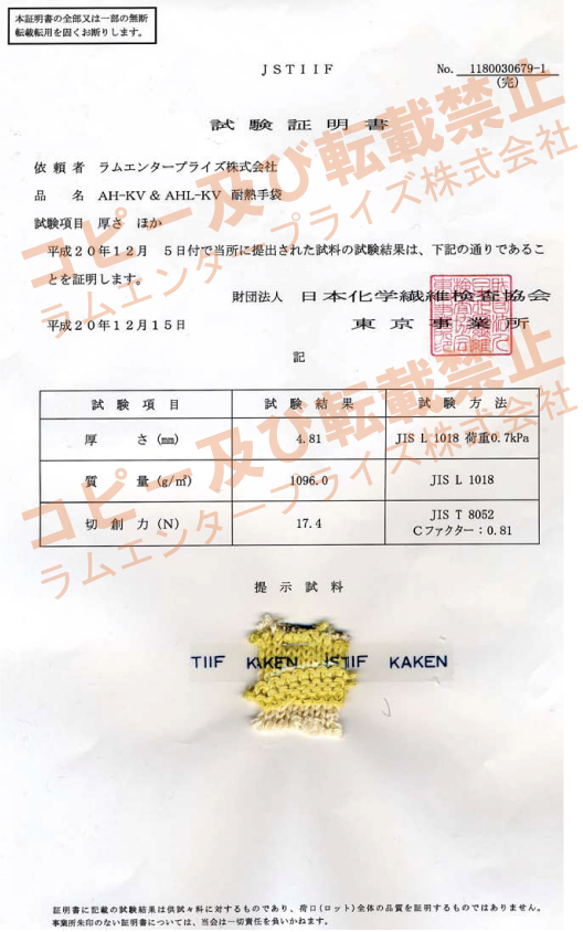 切創力 :17.4N (JIS T 8052) 日本化学繊維検査協会