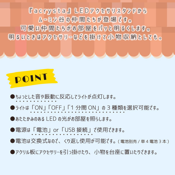 LED アクセサリー スタンド インテリア ライト アクリル アクセサリースタンド 小物 音感センサー 音 振動 自動点灯 消灯 acrysta アクリスタ ムーミン ART-MMN-01 129699 リトルミィ ART-MMN-02 129705 ニョロニョロ ART-MMN-03 129712 201908-03