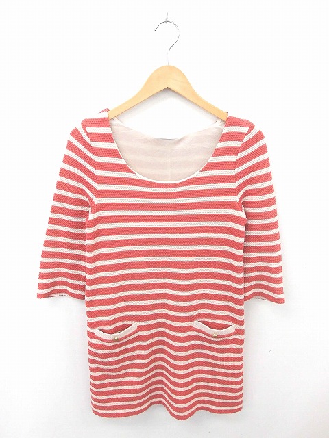 【中古】インデックス INDEX ワンピース ひざ丈 ボーダー プルオーバー ニット 七分袖 L 赤 薄茶 レッド ベージュ
