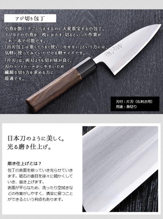 ■アジ切り包丁は、小魚を捌く・下ごしらえするのに大変重宝する小包丁。アジなどの小魚を三枚におろす・切るといった作業がこれ一本で可能です。
