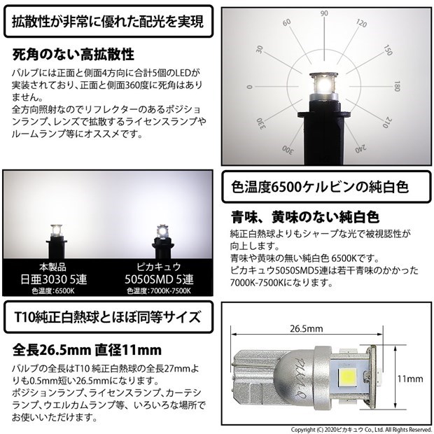 | サイズ | 全長:26.5mm/最大直径:11mm/幅:9.5mm ※純正T10白熱球サイズ 全長:27mm/最大直径:10mm/幅:9.5mm | |||