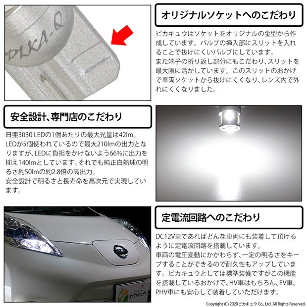 | 日亜化学工業製 3030 LEDを使用したT10バルブです。明るさ140lmです。 日本国内のLEDメーカー、日亜化学性工業のLED素子を使用しています。 純正のLEDライトや信号機にも使われるメーカーで品質は一級品です。 バルブには正面と側面4方向に合計5個のLEDが実装されており、正面と側面360度に死角はありません。 青味や黄味のない純白色6500Kです。 純正同等サイズ、全長26.5mmでポジションランプ、ポジションランプ、カーテシランプ、ウエルカムランプ等色々なところでお使いいただけます。 金型から作成したオリジナルソケットを使用。バルブ挿入部にスリットを入れ、抜けにくいバルブとなっています。 LEDの最大出力から66%に出力を抑え、LEDに負担をかけない安全設計。それでも純正白熱球50lmの約2.8倍の出力となります。 | ||||