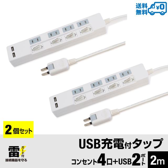 【2個セット・1個当たり1,949円・送料無料】STYLED USB充電付電源タップ コンセント×4口 USB×2ポート 合計2.4A 電源コード2m 18ヵ月保証 雷ガード 個別スイッチ スイングプラグ シャッター付コンセント iPhone iPad スマホ OAタップ 延長コード ホワイト STP4UA2W-2X2
