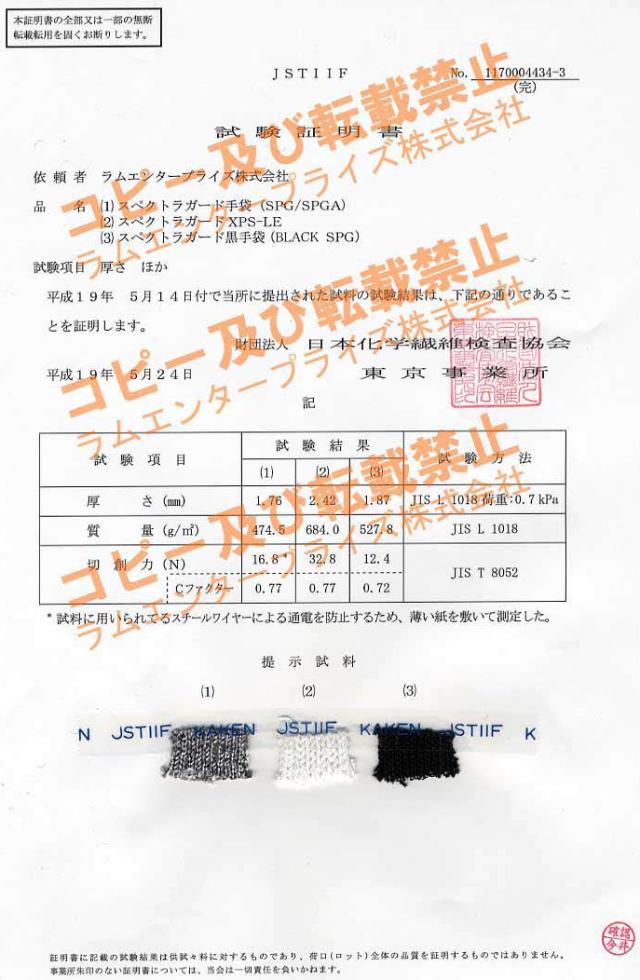 切創力:16.8N (JIS T 8052) 日本化学繊維検査協会