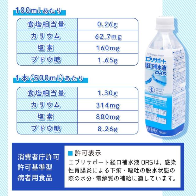 エブリサポート経口補水液ORSは、感染性胃腸炎による下痢・嘔吐の脱水状態の際の水分・電解質の補給に適しています。