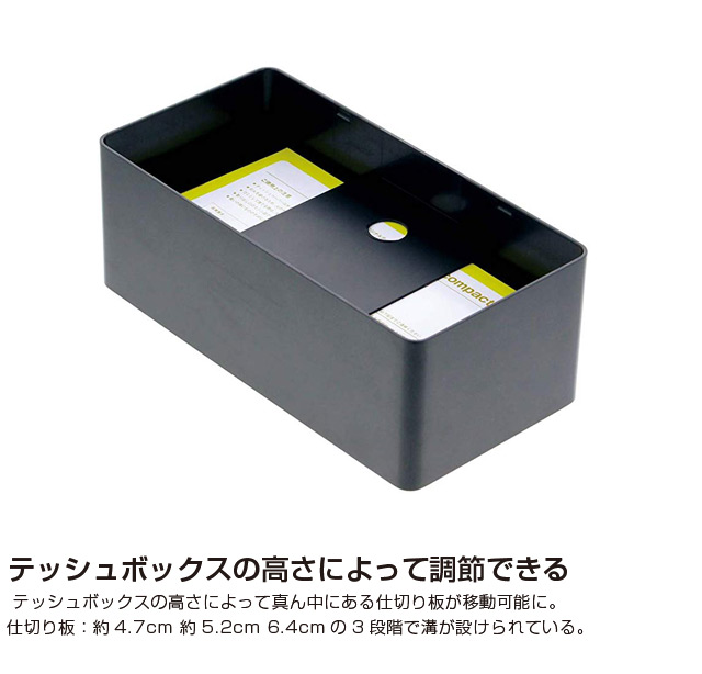 ※2個合わせて約9.5cmまでティッシュボックスの高さに合わせて仕切り板を使って約4.7/5.2/6.4cmの3段階に高さ調整できます。