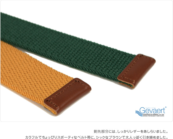 伸縮性のあるゴム素材で、快適なフィット感がうれしい。発色のいい楽しいカラーリングに、レザーでシックなアクセント。カラフルでスポーティな差し色、3.5cm幅のダブルリングベルトです。デニムにもチノにも、色んなボトムスにしっかりウエストマーク。