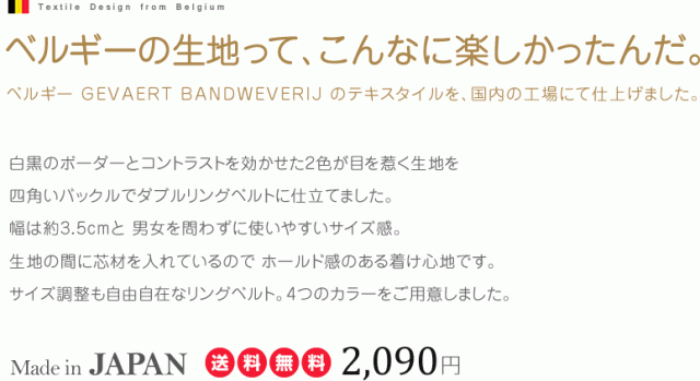 白黒のボーダーとコントラストを効かせた2色が目を惹く生地を 四角いバックルでダブルリングベルトに仕立てました。幅は約3.5cmと 男女を問わずに使いやすいサイズ感。生地の間に芯材を入れているので ホールド感のある着け心地です。サイズ調整も自由自在なリングベルト。4つのカラーをご用意しました。