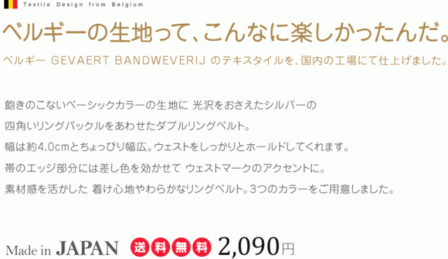 飽きのこないベーシックカラーの生地に 光沢をおさえたシルバーの四角いリングバックルをあわせたダブルリングベルト。幅は約4.0cmとちょっぴり幅広。ウェストをしっかりとホールドしてくれます。帯のエッジ部分には差し色を効かせて ウェストマークのアクセントに。素材感を活かした 着け心地やわらかなリングベルト。3つのカラーをご用意しました。