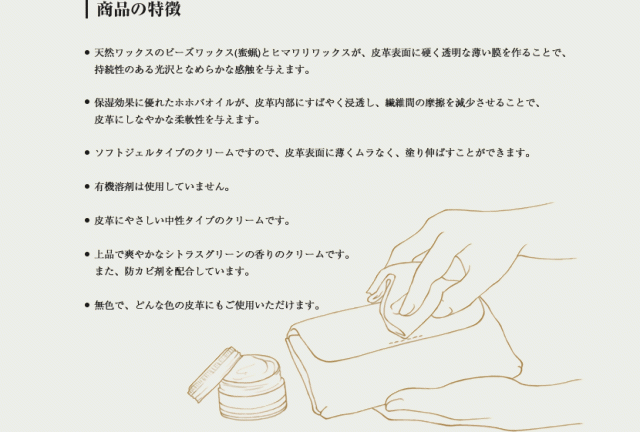 ・油分を含んだクリームですので、元の色より多少色が濃くなる場合もございます。また素材によっては色が濃くなり、戻らない場合もございます。