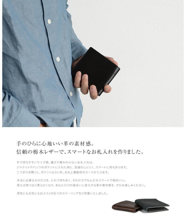 フルベジタブルタンニンなめしのこだわり栃木レザー。ナチュラルで味わい深い素材感を、日本国内の工場でお札入れに仕上げました。ポケットに入れてもすっきりスマート。カードとお札が入る、二つ折りのお財布です。
