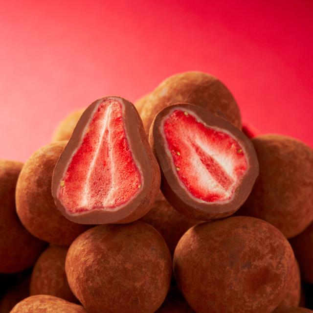 摘みたて苺をフリーズドライにして、口どけなめらかなミルクチョコレートで包みこみ、仕上げに濃厚で香り高いココアパウダーをまぶしました。苺のほんのりした甘みとサクサクした食感、そして神戸フランツのプレミアムチョコレートを使用したチョコレートのなめらかな口どけが口のなかで一体に。苺本来のおいしさを引き出すよう、甘さ控えめにこだわった、飽きのこない味わいです。神戸フランツオリジナルBOXに入れてお届け。