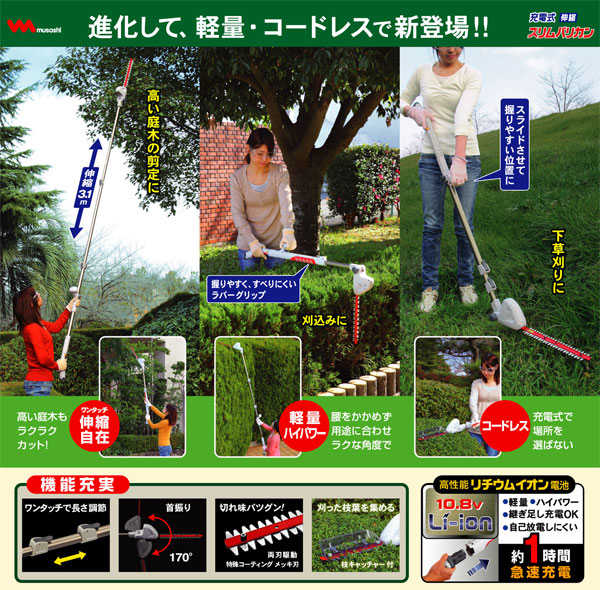 | 【 特徴 】 ・高い庭木の剪定もラクラクカット!(伸縮3.1mまで可能) ・腰をかがめず用途に合わせて、ラクな角度で、生垣の刈り込みも出来ます。 ・長さ調整に加え、首振り設定も出来るので、下草刈りにも便利です。 ・継ぎ足し充電OK!自己放電もしにくくなっていて、約1時間での高速充電が可能です。 ・握りやすく、すべりにくいラバーグリップ付き ・充電式なので、場所を選びません。 | ||||||
