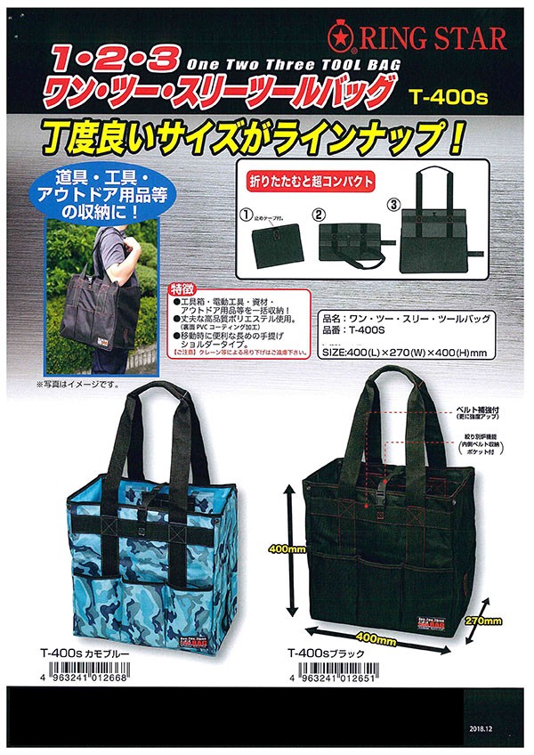 ■リングスター ツールバッグ T-400s ブラック 道具・工具・アウトドア用品の収納に! 折りたたむと超コンパクト! 黒