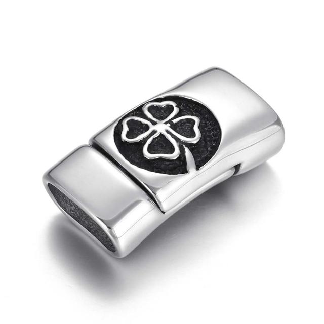 リング型のエンブレムに幸運の四つ葉のクローバーをデザインした12ミリx6ミリの平らな革紐を差し込めるゴツメのブレスレット用ステンレス製止め具エンドパーツ。