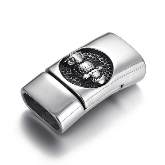 リング型のエンブレムに梟(フクロウ)をデザインした12ミリx6ミリの平らな革紐を差し込めるゴツメのブレスレット用ステンレス製止め具エンドパーツ。