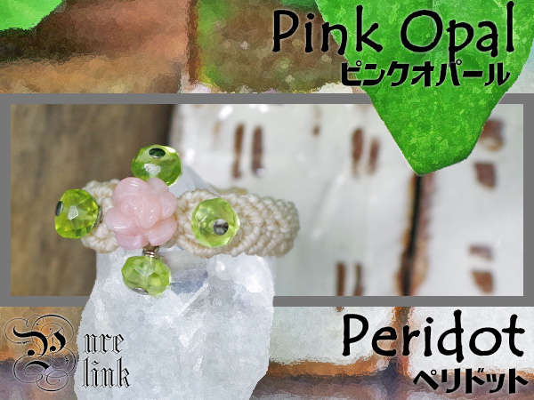愛の誓い・桃薔薇『ピンクオパール』と『ペリドット』マクラメ編みリング(指輪)2