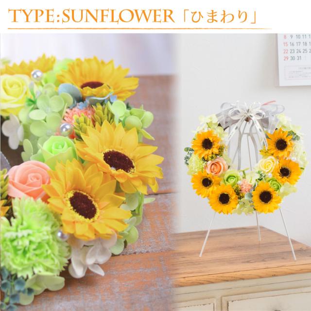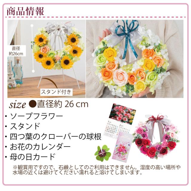 | お花 | ・ソープフラワー「リース」 リース本体:直径約26cm スタンドを含む高さ:約36cm ※一つ一つ手作りのため、花の配置や装飾品の色等が写真と多少異なる場合がございます。 ※ソープフラワーは観賞用のため、石鹸や入浴剤として使用しないでください。 ※一部の装飾品は石鹸素材でないものを使用しています。 ※香りは時間とともに薄れていきます。ご了承ください。 |
