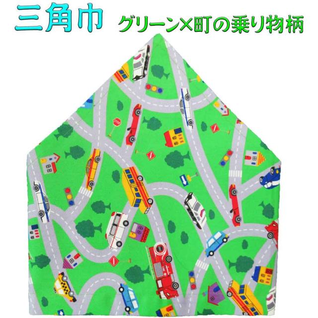 三角巾(グリーン×町の乗り物柄 ゴム留め)子供用 三角巾 子供三角巾 幼児用三角巾 通園 通学 入園 入学 幼稚園 保育園 小学校 ロリポップ
