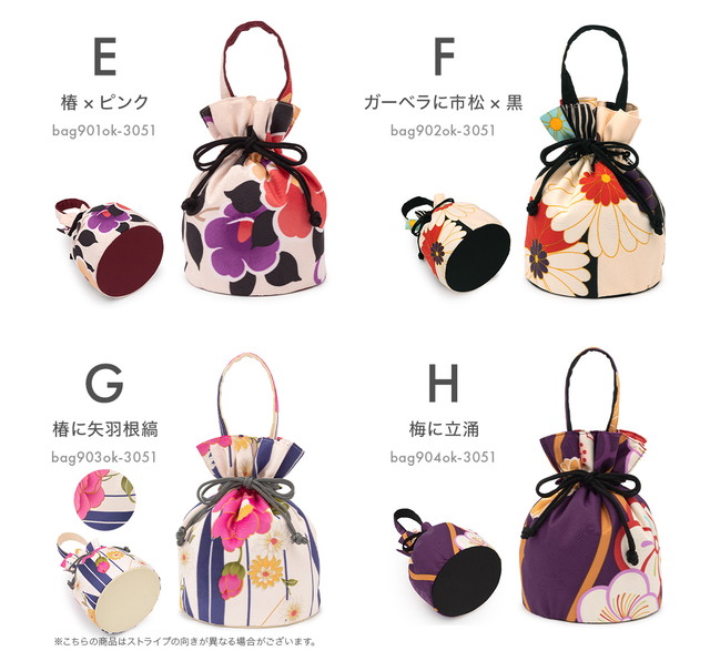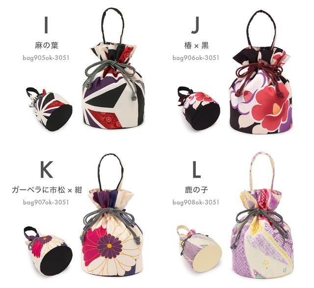 バッグとハンドルは地紋のあるふっくらとした縮緬(ちりめん)生地に、椿や梅などの花々や縞に市松などの和柄が描かれたレトロモダンなデザインです。