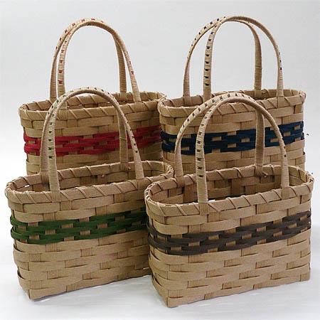 ちょっとしたお出かけにも便利なサイズ。シンプルなクラフト色にポイントカラーを編みこんだ手付きバッグ。とばし編みでポイントをつけてみました。