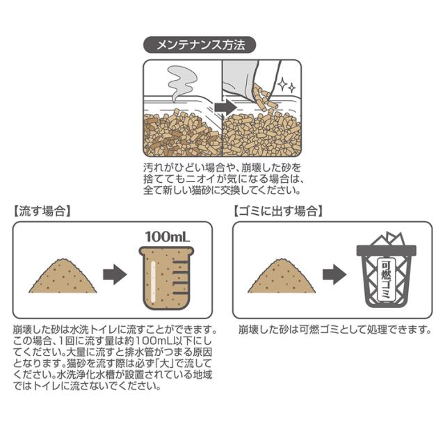 猫砂はトイレに流すことができます。この場合、1回に流す量は約100ml以下にしてください。大量に流すと配水管が詰まる原因となります。