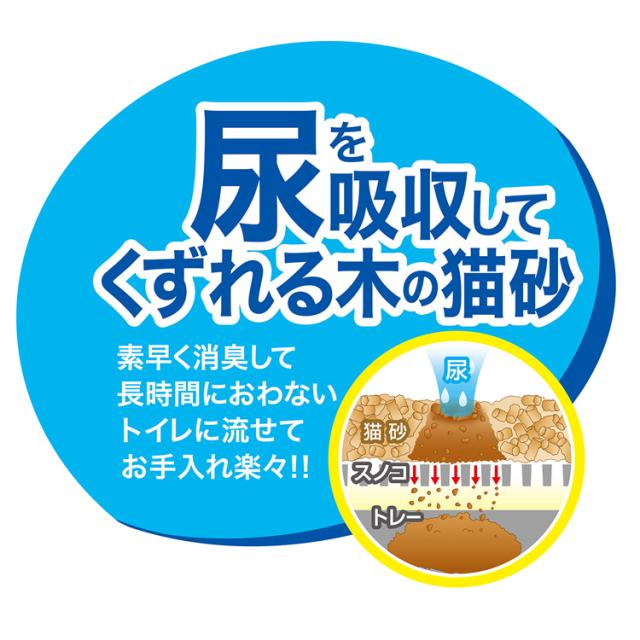 ●ベントナイトフリー:主原料にリサイクル材の木粉を使用しているので環境にも優しく、フィトンチッドにより消臭効果もあります。ベントナイト(粘土鉱物)は一切使用していないので、軽くて持ち運びにも便利です。