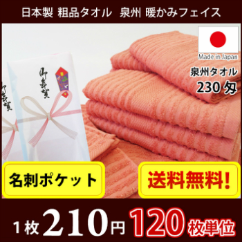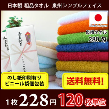 【送料無料】 タオル 粗品タオル 国産 日本製 泉州タオル280匁 シンプルフェイスタオル のし 名刺ポケット付きビニール 粗品 お年賀タオル 120枚単位