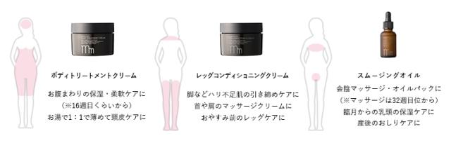 使い方 スムージングオイル 適量を手に取り、デリケートゾーンや乳頭、おしりなど、ケアが必要な部分や乾燥が気になる部分にやさしくなじませます。 マッサージが難しい方は、コットンに含ませてオイルパックにしたり、塗るだけでもOKです。 ボディトリートメントクリーム 適量を手に取り、手のひらの体温で温めながら気になる部分にクリームをやさしくなじませてください。肌を温めるイメージでゆっくりとなじませるのがおすすめ。 レッグコンディショニングクリーム 適量を手に取り、気になる部分に軽くなじませます。特に気になる部分には軽くマッサージしつつ、集中的に塗り込むようになじませてください。マッサージがしにくい方は塗るだけでもOKです。 | ||||||||