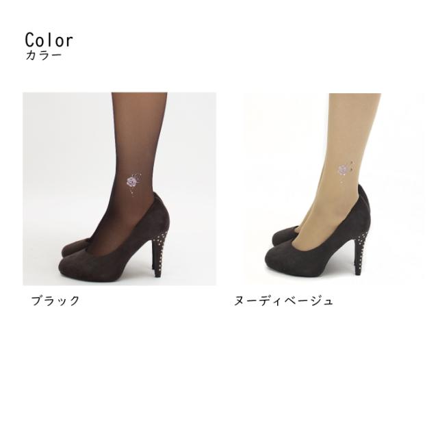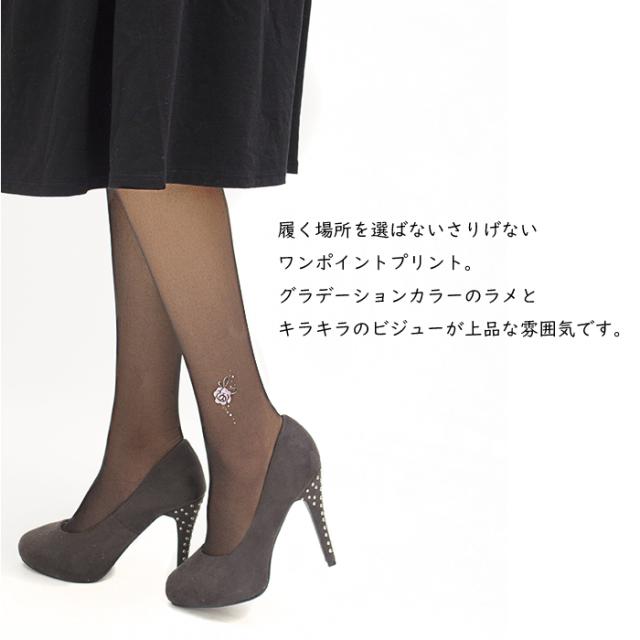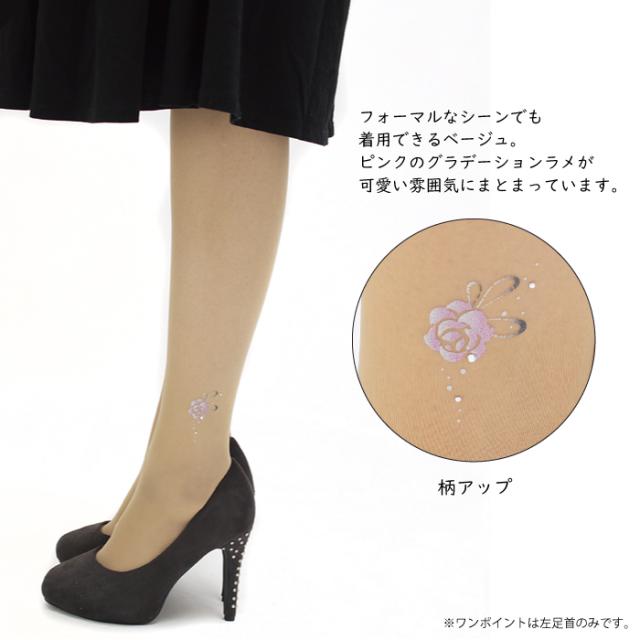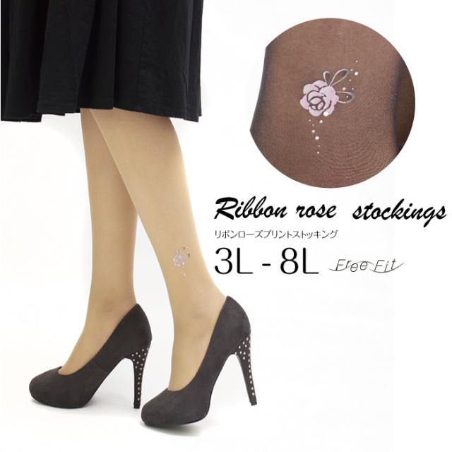 レディース パンスト 3L〜8L ワンポイント ローズリボン メール便2足まで プリントストッキング 柄ストッキング 日本製 FreeFit フリーフィット 大きいサイズ LegStyle