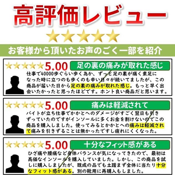 - 朝頼んだせいか、翌日にはポストに入ってた。ビックリ?商品の方は、説明にあったように膝やかかとの負担が軽減されて普段よりズキッとする痛みが減った。いつもよりスタスタと歩けたような気がする。