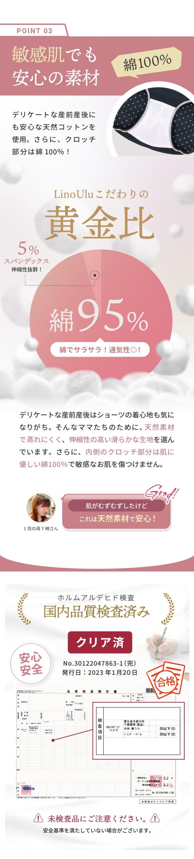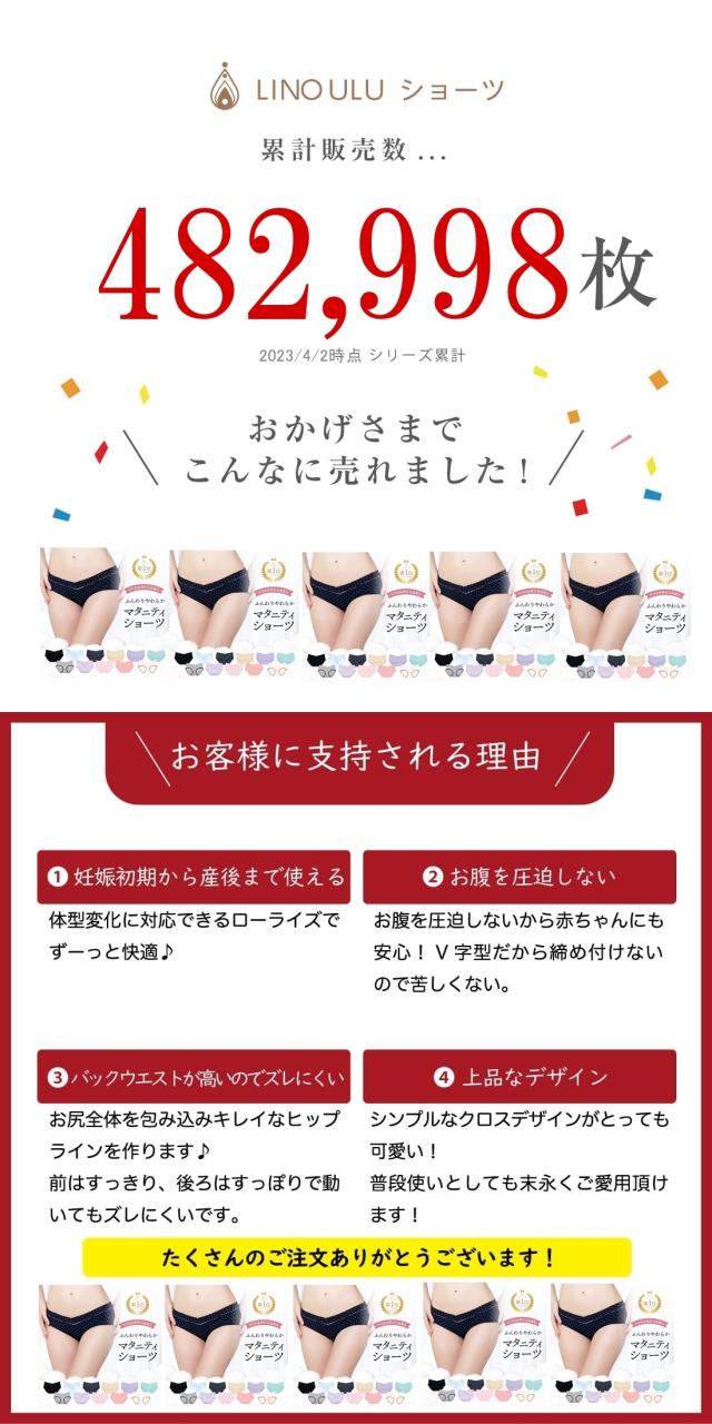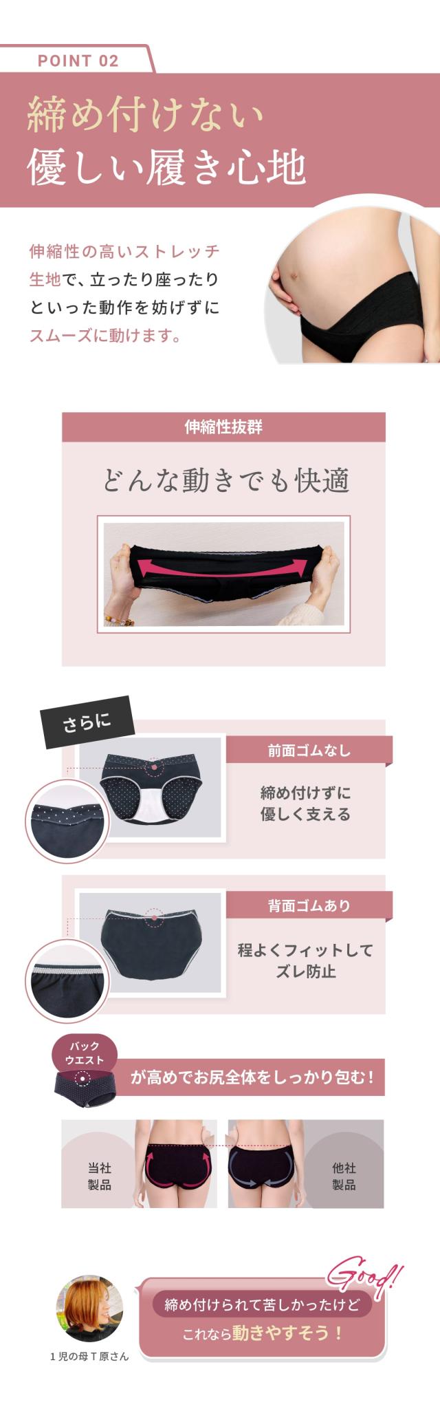 - 妊娠をしてから、以前使用していた下着がキツく締めつけによる吐き気が凄かった為、何かいい商品ないか?と思い試しに1着購入させて頂きました。(金額的にも試し買いがしやすい金額だったので。) 私個人の感想ですが、ぶっちゃけマタニティ専門店のものより締めつけもなく着心地も最高でした。急いで、追加購入しましたが対応も早く大満足でした。 またお世話になる事があると思いますが、その時はよろしくお願いします。