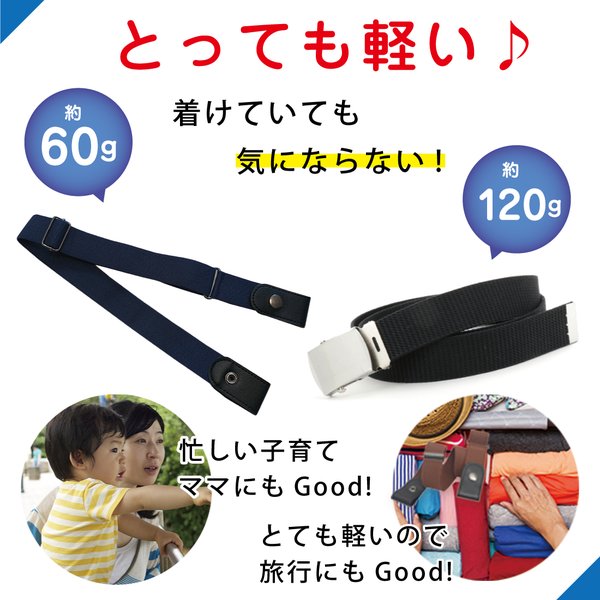 - 某通販ではディズニー柄のレディースの取り扱いしかなく、こちらのお店では無地でメンズも使用できるため、主人と息子用に購入しました。買ったもののウエストが大きくて一度も履かずにいたジーパンをこのベルトのおかげで履く事ができ、二人共喜んでいます。特にトイレが近い主人はこれは便利だと目を輝かせて喜んでいます。黒2本とネイビー1本を購入したので、私も含めて使い分けたいと思います。