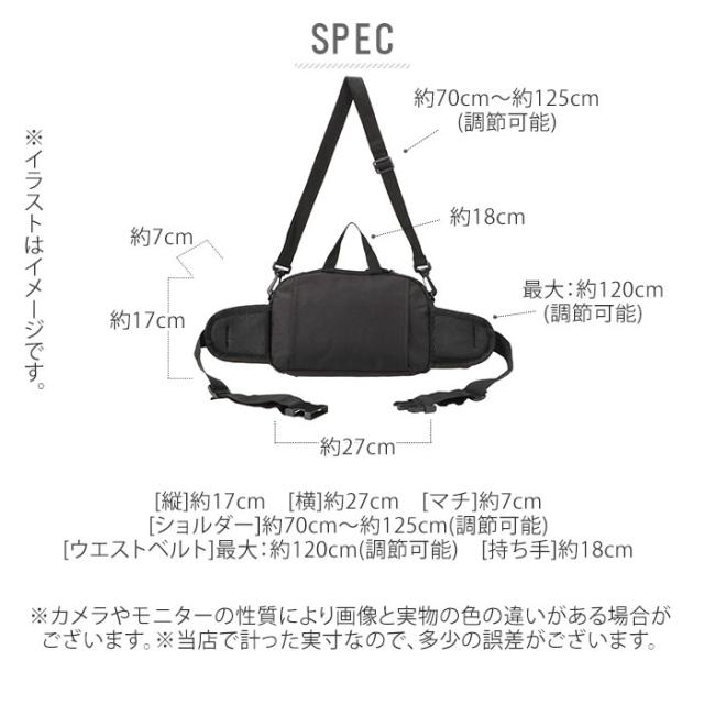 | サイズ | [縦]約17cm [横]約27cm [マチ]約7cm [ショルダー]約70cm〜約125cm(調節可能) [ウエストベルト]最大:約120cm(調節可能) [持ち手]約18cm ※サイズは当店平置き実寸サイズです。実際の商品とは多少の誤差が生じる場合がございます。あらかじめご了承ください。 |