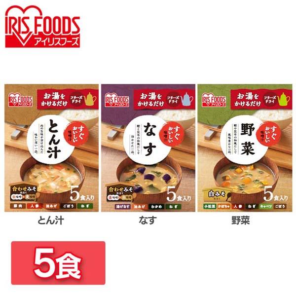 【5食セット】すぐおいしい 味噌汁 全3種類 味噌汁 みそしる ミソシル すぐおいしい フリーズドライ お味噌汁 おみそしる みそ汁 トン汁 豚汁 ぶたじる 茄子 なす ナス 野菜 やさい アイリスフーズ