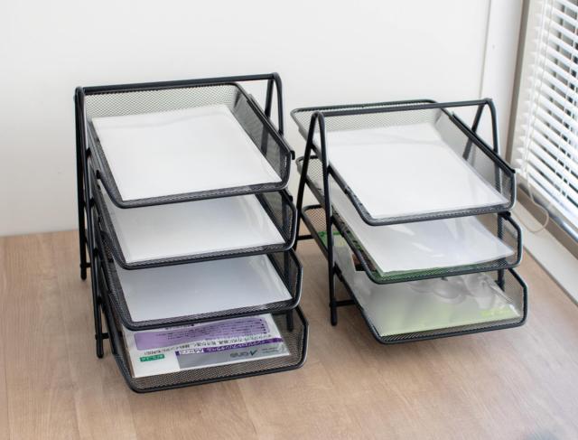 書類だけでなく、文房具や小物類をトレーにまとめて収納することで、デスク周りをすっきり整頓できます。必要な物をすぐ取り出せるので、作業効率のアップにもつながります。