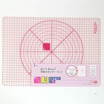 厚さ1.6mmの薄型カッターマット。表面はシボ加工で紙などが滑りにくい仕上げです。 中芯に色がついているのでキズが目立ちにくい仕様。表裏面が軟質、中芯が硬質の三層構造です。 1マス10mm刻みの方眼、円形ガイドもあるので簡易ゲージボードとしても便利小物です。 汚れても簡単にふき取れるのでニス塗りの台にも。