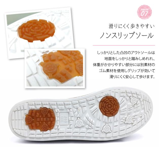体重がかかりやすい部分には別素材のゴム素材を使用しグリップが効いて滑りにくく安心して歩けます。