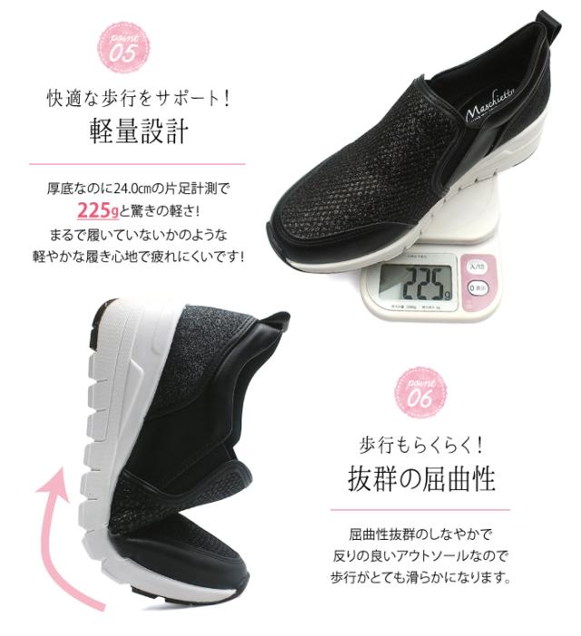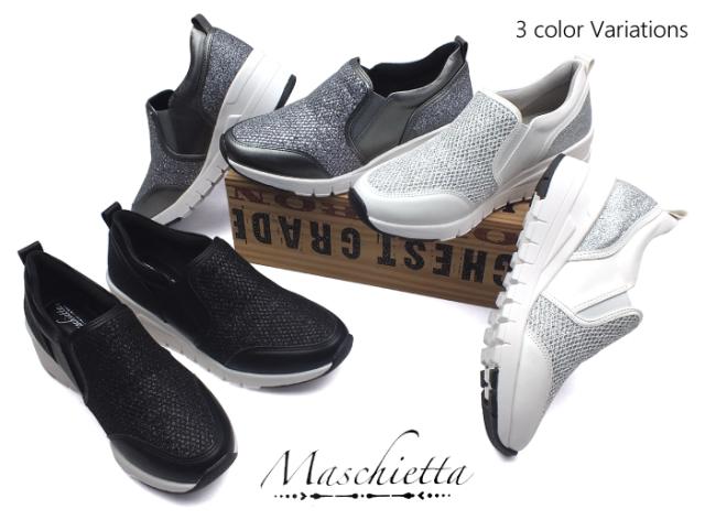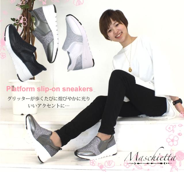 maschietta-マスチェッタ- グリッターが眩しい厚底スリッポンスニーカー 3E 幅広設計 外反母趾対策 カップインソール 痛くない 屈曲性 快適 軽量 防滑ソール 滑らない
