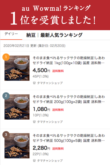 - 毎日納豆を食べ続ける事は、私には、無理、と、あきらめていたのですが、ドライ納豆をヨーグルトに入れたり、そのままポリポリと頂いたりして美味しく頂いております。これなら、続けられそうです。有難うございます...