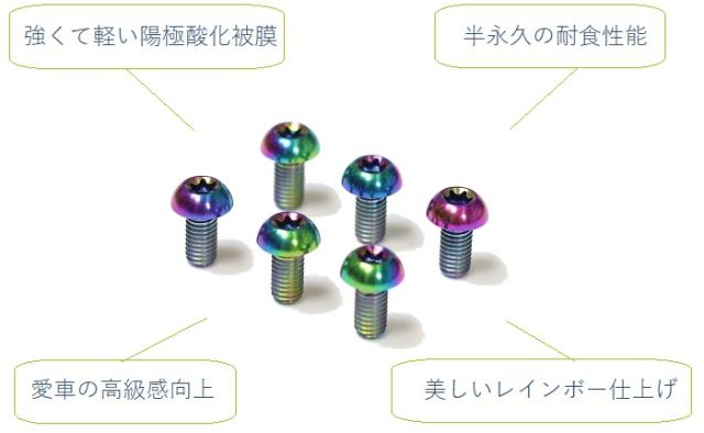 熱に強く、強度の高いチタン合金を使用 高級感のある虹色の酸化皮膜仕上げ 【 自転車1台分(前後)を変更する場合は2セットをお買い求めください 】