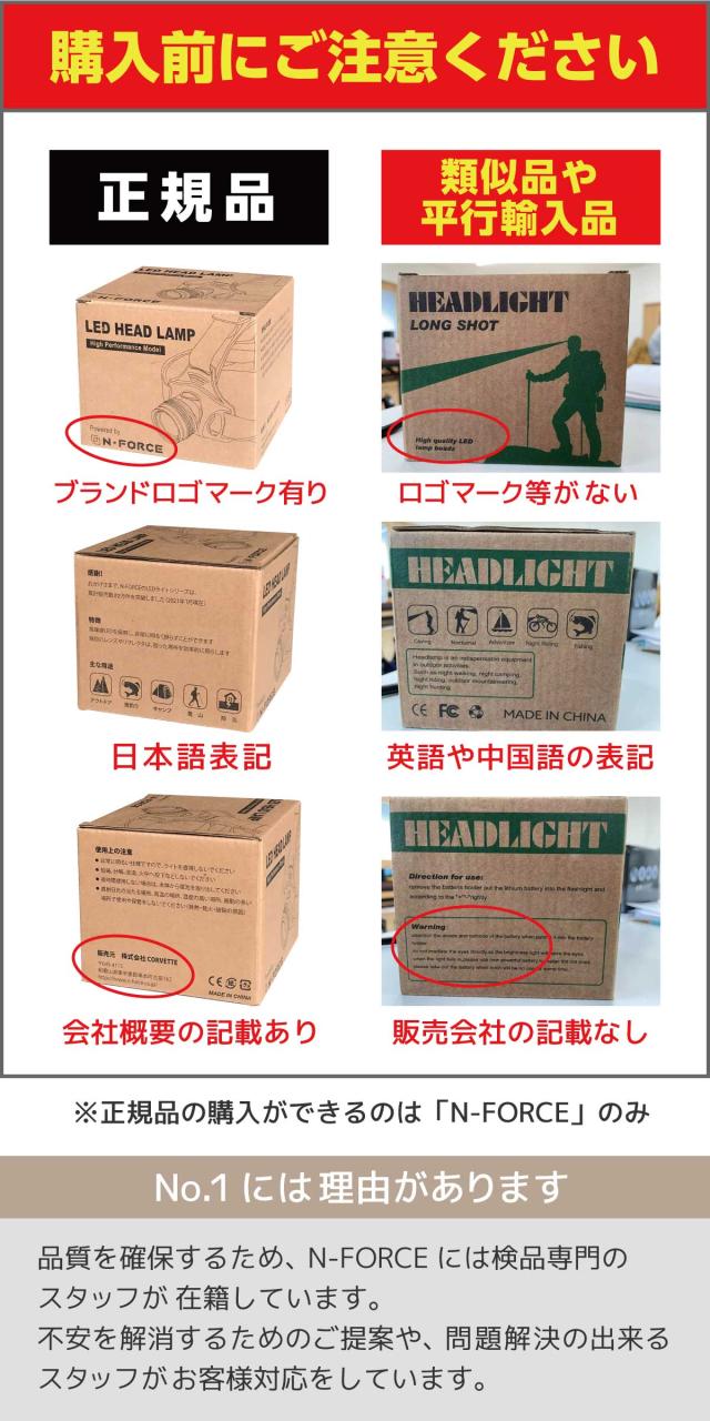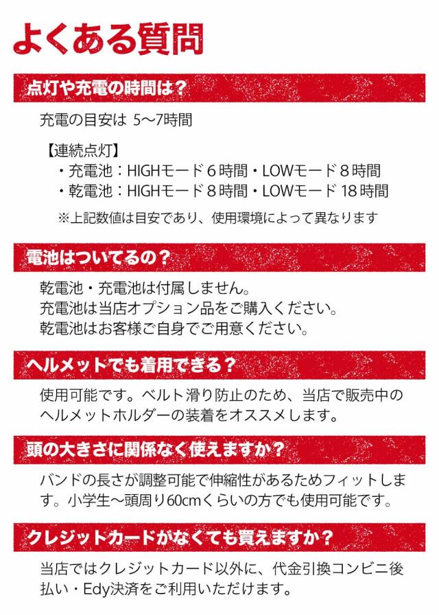 | 使用上の注意 | ライト製品をご購入の方は必ずお読みくださいませ。 ご購入後、商品を長期間使用されない場合、定期的にライトの点灯を行って下さい。 (目安期間1〜2ヶ月に一度) ※定期的にライトの点灯を行わなかった場合、電池の劣化等の理由で使用回数に関係なく不具合が起こる可能性がございます。 また、乾電池を使用するヘッドライトにつきましては 使用後は本体から乾電池を取り出して保管することをお勧めいたします。 ※乾電池を装着したまま長期間保管していると、乾電池が液漏れし故障の原因になる可能性がございます。 |