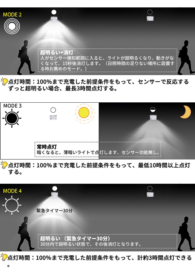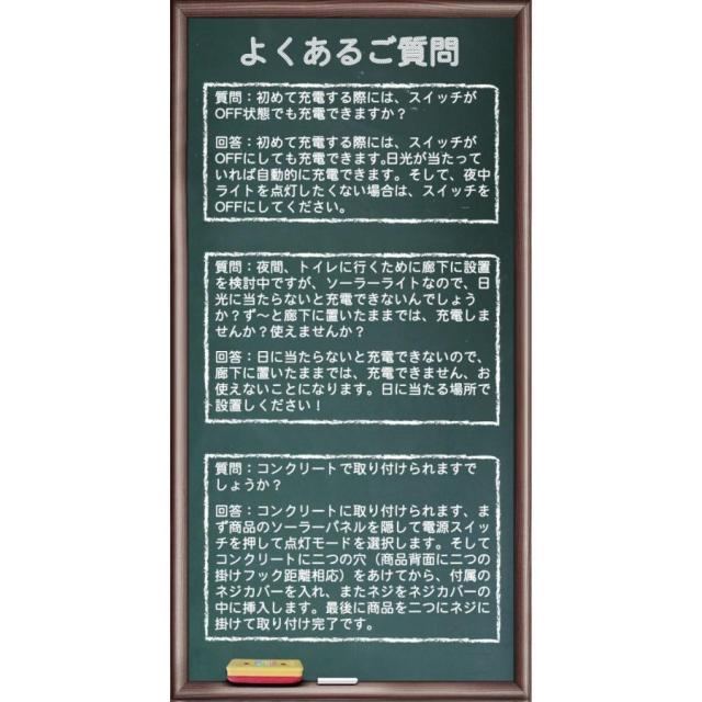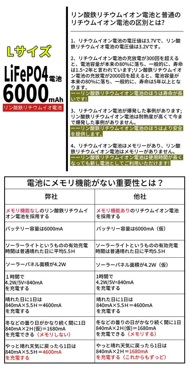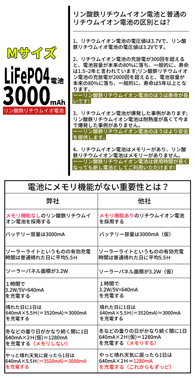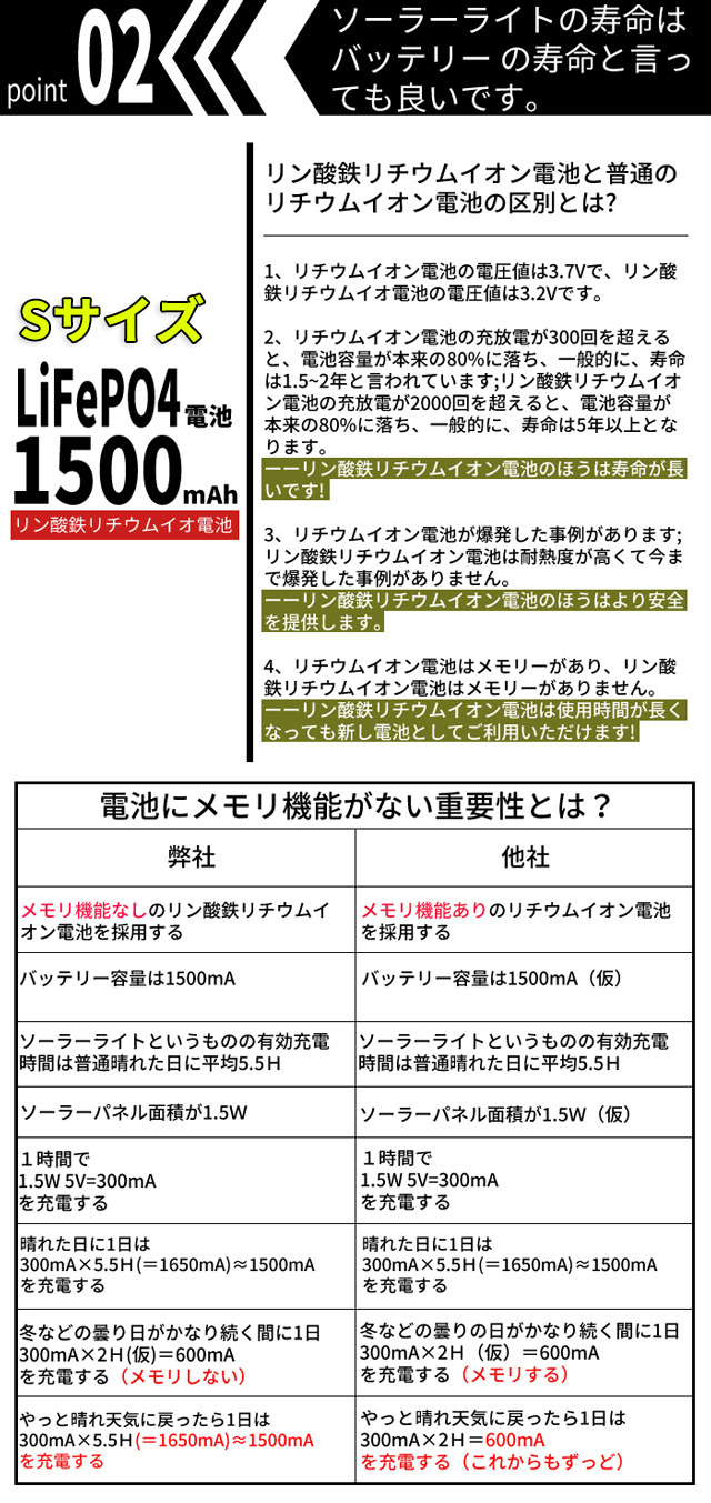 2、くもりや雨の場合は十分に充電されない為、LEDライトの明るさが劣るほか点灯時間が短縮することもございます。