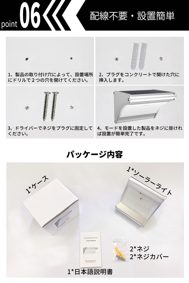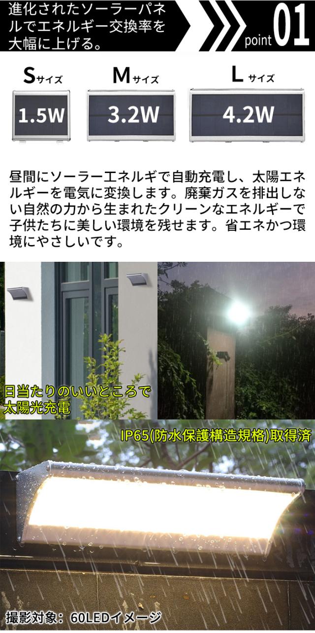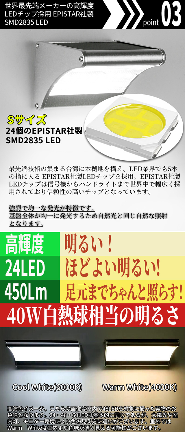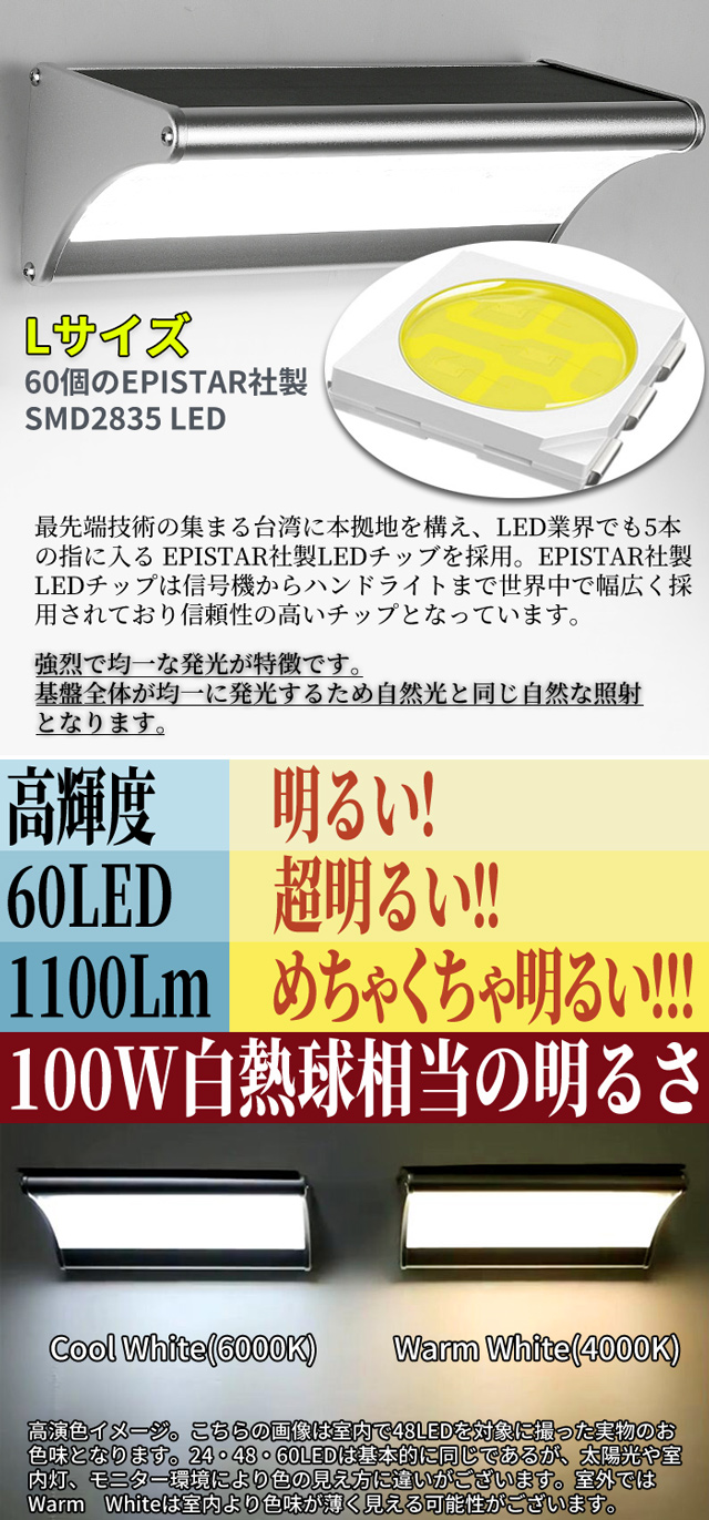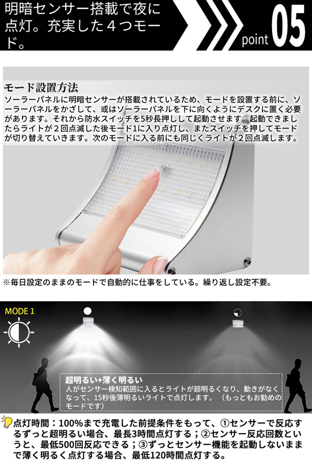 2、くもりや雨の場合は十分に充電されない為、LEDライトの明るさが劣るほか点灯時間が短縮することもございます。