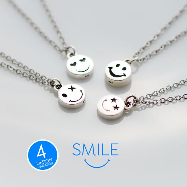 にっこりスマイルのニコちゃんマークのネックレスです。目が星になったり、ハートになったりと表情が豊かな4つのパターンのデザインが揃いました!スマイリーマークはシルバー925製。付属のチェーンは金属アレルギー対策でステンレス製です。