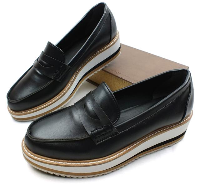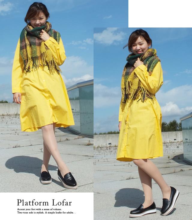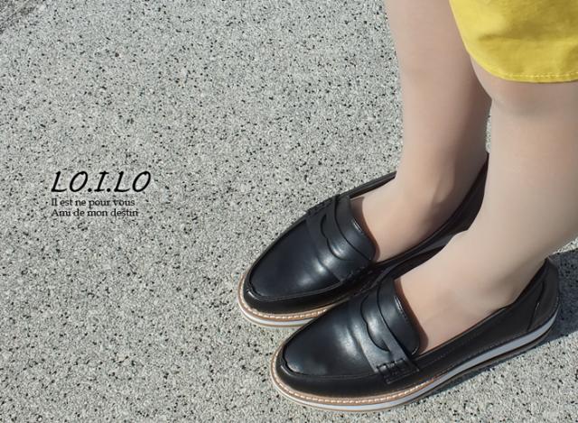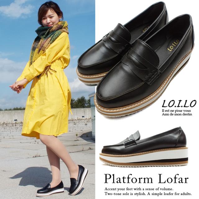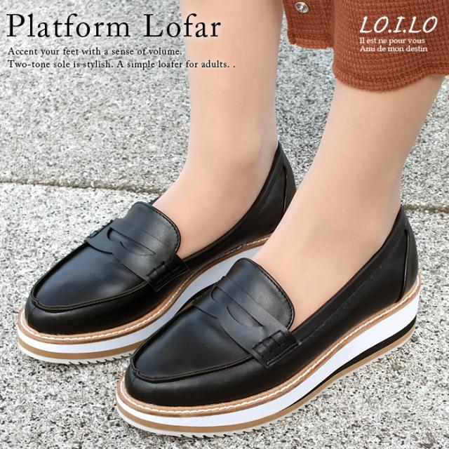 レディース 厚底ローファー。ツートンカラーのソールでお洒落なアクセント。トラッド プラットフォーム ブラック 黒 滑らない LO.I.LO[ロイロ]