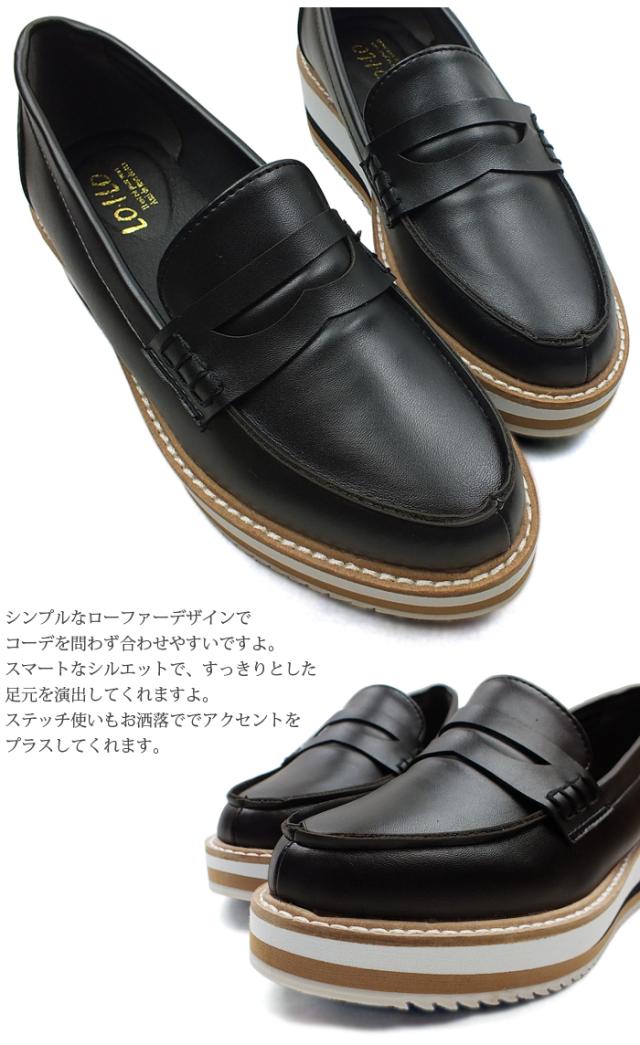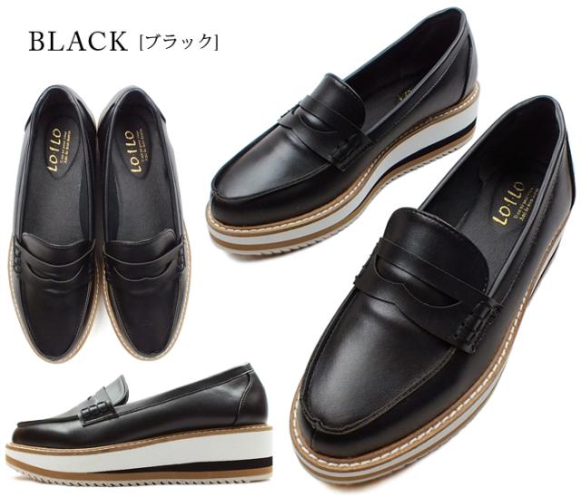 LO.I.LO ロイロ レディース 厚底ローファー。ツートンカラーのソールでお洒落なアクセント。トラッド プラットフォーム ブラック 黒 滑らない 2204501